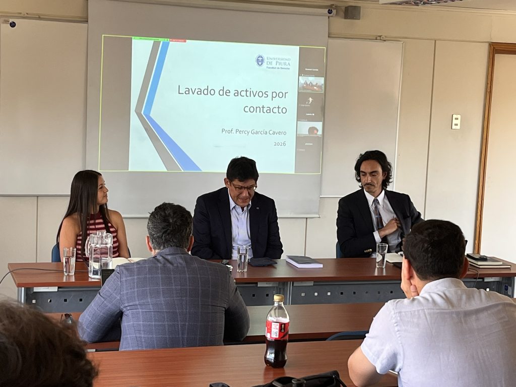 La ponencia central estuvo a cargo del profesor Percy García Cavero, destacado académico de la Universidad de Piura, quien analizó las complejidades dogmáticas que presenta el lavado de activos por contacto frente al tradicional lavado «de proceso» u ocultación. Durante su exposición, el doctor García Cavero trazó el origen de estas figuras en convenciones internacionales como las de Viena, Palermo y Mérida, y enfatizó la necesidad de establecer límites normativos estrictos a la «contaminación por contacto» de los bienes de origen ilícito. Según el experto, una expansión indeterminada de dicha contaminación afectaría negativamente el dinamismo del sistema económico, cuestionando además la viabilidad de criminalizar el autolavado en esta modalidad y debatiendo sobre las fronteras del tipo subjetivo ante la imprudencia inexcusable.